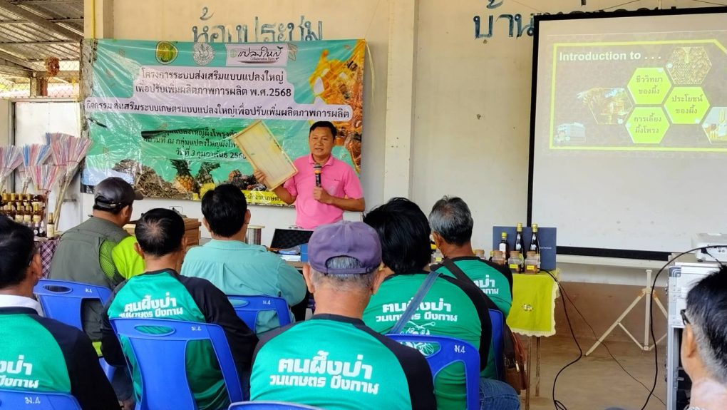 วันที่ 18 กุมภาพันธ์ 2568 นางสาวทัศพร คำสีทา ผู้อำนวยการศูนย์ส่งเสริมและพัฒนาอาชีพการเกษตร จังหวัดขอนแก่น มอบหมายให้นายสนอง เศษโม้ นักวิชาการส่งเสริมการเกษตรชำนาญการ เป็นวิทยากรบรรยายให้ความรู้เกี่ยวกับการเลี้ยงผึ้ง ตามโครงการระบบส่งเสริมเกษตรแบบแปลงใหญ่เพื่อปรับเพิ่มผลิตภาพการผลิต กิจกรรมหลักส่งเสริมระบบเกษตรแบบแปลงใหญ่เพื่อปรับเพิ่มผลิตภาพการผลิต กิจกรรมย่อยจัดเวทีแห่งการเรียนรู้ ถ่ายทอดความรู้ให้แก่เกษตร จำนวน 30 ราย ณ กลุ่มแปลงใหญ่ ผึ้งโพรงตำบลน้ำจั้น อำเภอเซกา จังหวัดบึงกาฬ