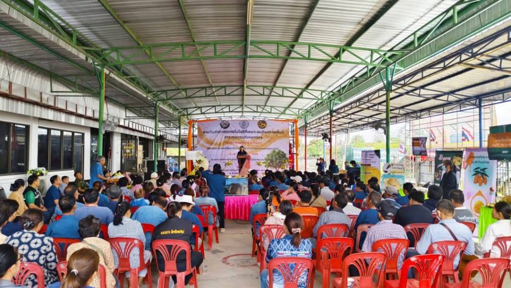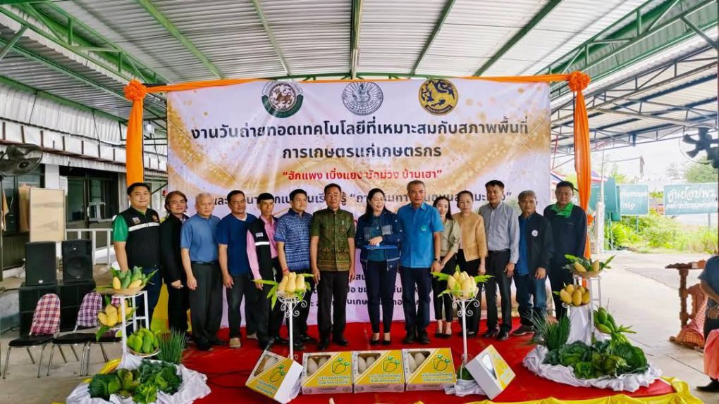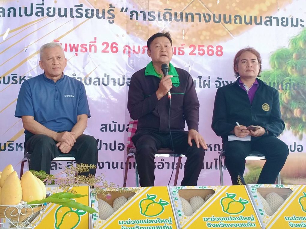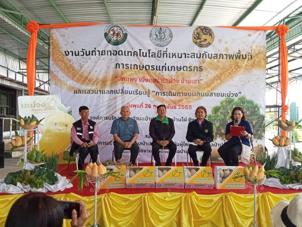 วันที่ 26 กุมภาพันธ์ 2568 นางสาวทัศพร คำสีทา ผู้อำนวยการศูนย์ส่งเสริมและพัฒนาอาชีพการเกษตร จังหวัดขอนแก่น มอบหมายให้นายสนอง เศษโม้ นักวิชาการส่งเสริมการเกษตรชำนาญการ และนางสาวเพ็ญนภา คามวุฒิ นักวิชาการส่งเสริมการเกษตรชำนาญการ ร่วมงานวันถ่ายทอดเทคโนโลยีที่เหมาะสมกับสภาพพื้นที่การเกษตรแก่เกษตรกร “ฮักแพง เบิ่งแยง บักม่วง บ้านเฮา” โดยร่วมจัดนิทรรศการ และถ่ายทอดเทคความรู้แก่เกษตรกรด้านแมลงเศรษฐกิจ (ชันโรง) ซึ่งเป็นแมลงที่ช่วยผสมเกสรพืช และร่วมเวทีเสวนาแลกเปลี่ยนเรียนรู้ หัวข้อ “การเดินทางบนถนนสายมะม่วง” ณ องค์การบริหารส่วนตำบลป่าปอ ตำบลป่าปอ อำเภอบ้านไผ่ จังหวัดขอนแก่น