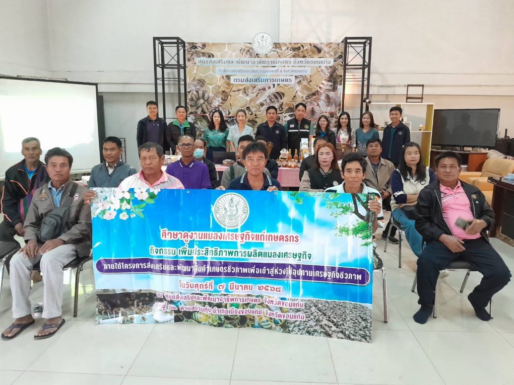 วันที่ 7 มีนาคม 2568 นางสาวทัศพร คำสีทา ผู้อำนวยการศูนย์ส่งเสริมและพัฒนาอาชีพการเกษตร จังหวัดขอนแก่น พร้อมด้วยเจ้าหน้าที่ศูนย์ฯ ร่วมต้อนรับ และถ่ายทอดความรู้ด้านแมลงเศรษฐกิจแก่เกษตรกร จำนวน 20 ราย ที่เข้าร่วมโครงการส่งเสริมและพัฒนาสินค้าเกษตรชีวภาพเพื่อเข้าสู่ห่วงโซ่อุปทานเศรษฐกิจชีวภาพ กิจกรรมเพิ่มประสิทธิภาพการผลิตแมลงเศรษฐกิจ และเจ้าหน้าที่ส่งเสริมการเกษตรที่รับผิดชอบโครงการระดับจังหวัด และระดับอำเภอ จากสำนักงานเกษตรอำเภอสุวรรณคูหา และสำนักงานเกษตรจังหวัดหนองบัวลำภู เข้าศึกษาดูงานแมลงเศรษฐกิจ ตามจุดเรียนรู้ต่างๆภายในศูนย์ฯ เพื่อเพิ่มพูนองค์ความรู้ในการประกอบอาชีพด้านการเลี้ยงแมลงเศรษฐกิจ ณ ศูนย์ส่งเสริมและพัฒนาอาชีพการเกษตร จังหวัดขอนแก่น