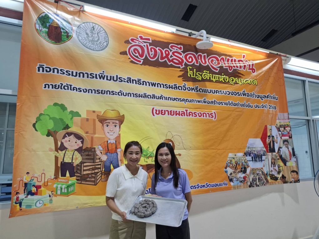 ร่วมอบรมการแปรรูปจิ้งหรีด ได้แก่ ไส้กรอกอีสานจิ้งหรีด หมูยอจิ้งหรีด และลูกชิ้นจิ้งหรีด ในงาน จิ้งหรีดขอนแก่น โปรตีนแห่งอนาคต กิจกรรมการเพิ่มประสิทธิภาพการผลิตจิ้งหรีดแบบครบวงจรเพื่อสร้างมูลค่าเพิ่ม ภายใต้โครงการยกระดับการผลิตสินค้าเกษตรคุณภาพเพื่อสร้างรายได้อย่างยั่งยืน ประจำปี 2568(ขยายผลโครงการ) ณ คณะเทคโนโลยี (อาหาร) มหาวิทยาลัยขอนแก่น อำเภอเมืองขอนแก่น จังหวัดขอนแก่น