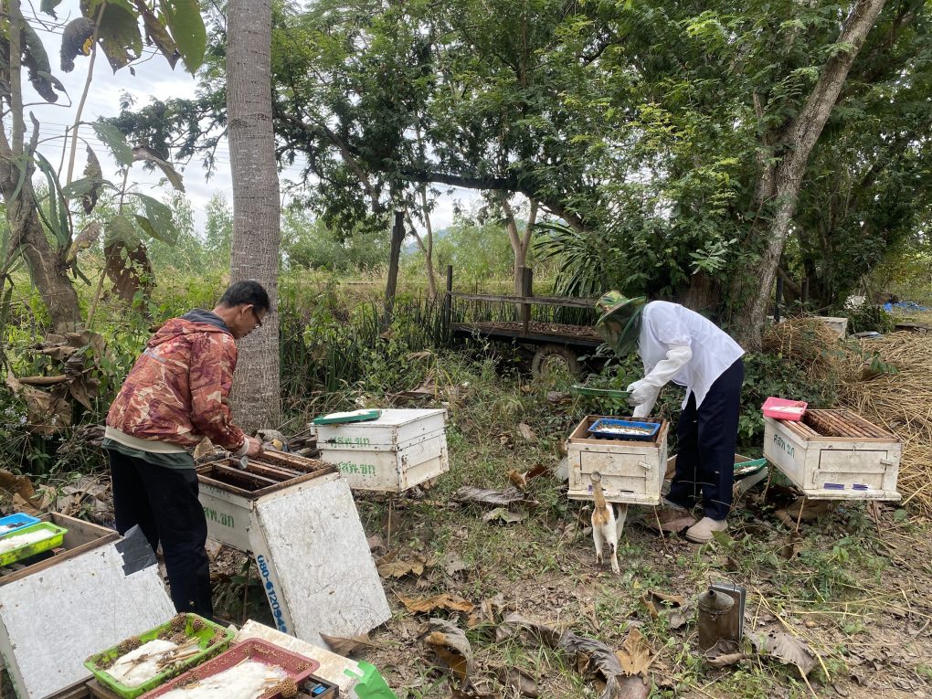และอำเภอภูกระดึง จังหวัดเลย จำนวน 22 คู่มัดฟาง ตรวจสุขภาพผึ้งพันธุ์ กำจัดศัตรูรบกวน และให้อาหารเสริม ณ ตำบลผานกเค้า อำเภอภูกระดึง จังหวัดเลย