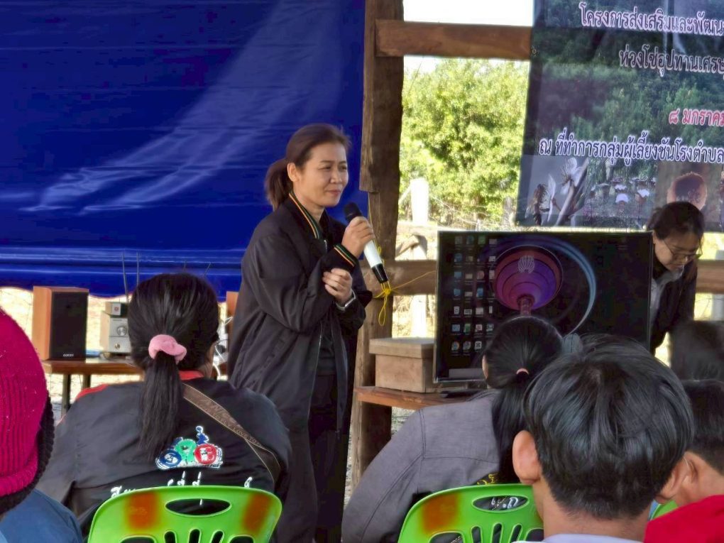 และนางสาววราภรณ์ เรืองศักดิ์ นักวิชการส่งเสริมการเกษตรชำนาญการ เป็นวิทยากรถ่ายทอดความรู้“การเลี้ยงและจัดการฟาร์มชันโรง และการเพิ่มมูลค่าผลิตภัณฑ์ชันโรงแก่เกษตรกร จำนวน 20 ราย เพื่อพัฒนาความรู้และทักษะของเกษตรกรของผู้เลี้ยงชันโรง